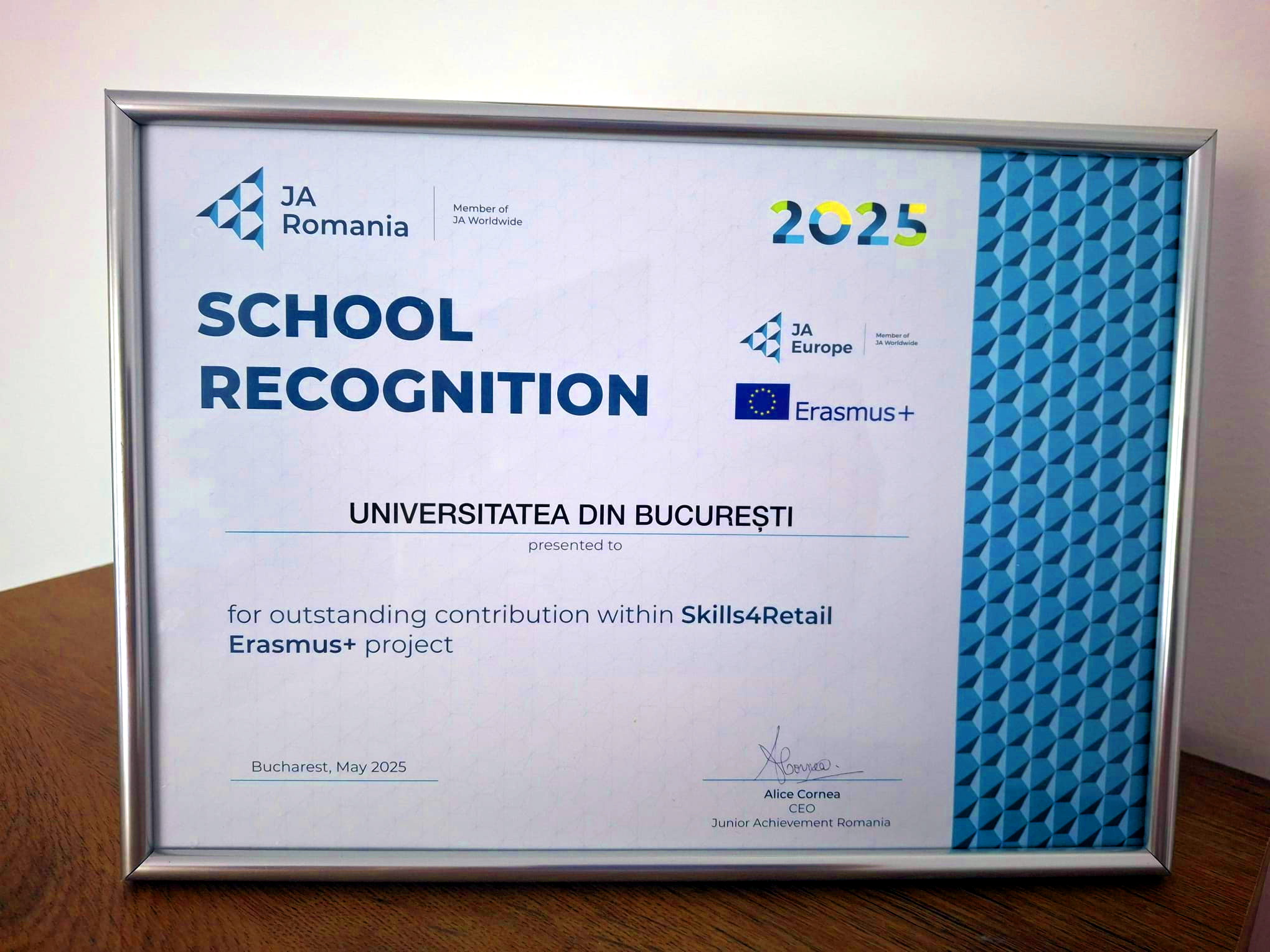 În data de 28 mai, cadre didactice ale Facultății de Administrație și Afaceri au participat la  Gala Junior Achievement România – „Investește în educație”. Universitatea din București a primit distincția School Recognition pentru contribuția sa în cadrul proiectului Erasmus+ Skills4Retail. Acest proiect este o inițiativă europeană finanțată prin programul Erasmus+, care urmărește să sprijine transformarea durabilă a sectorului de retail prin dezvoltarea competențelor în trei direcții esențiale: digitalizare, sustenabilitate și reziliență.