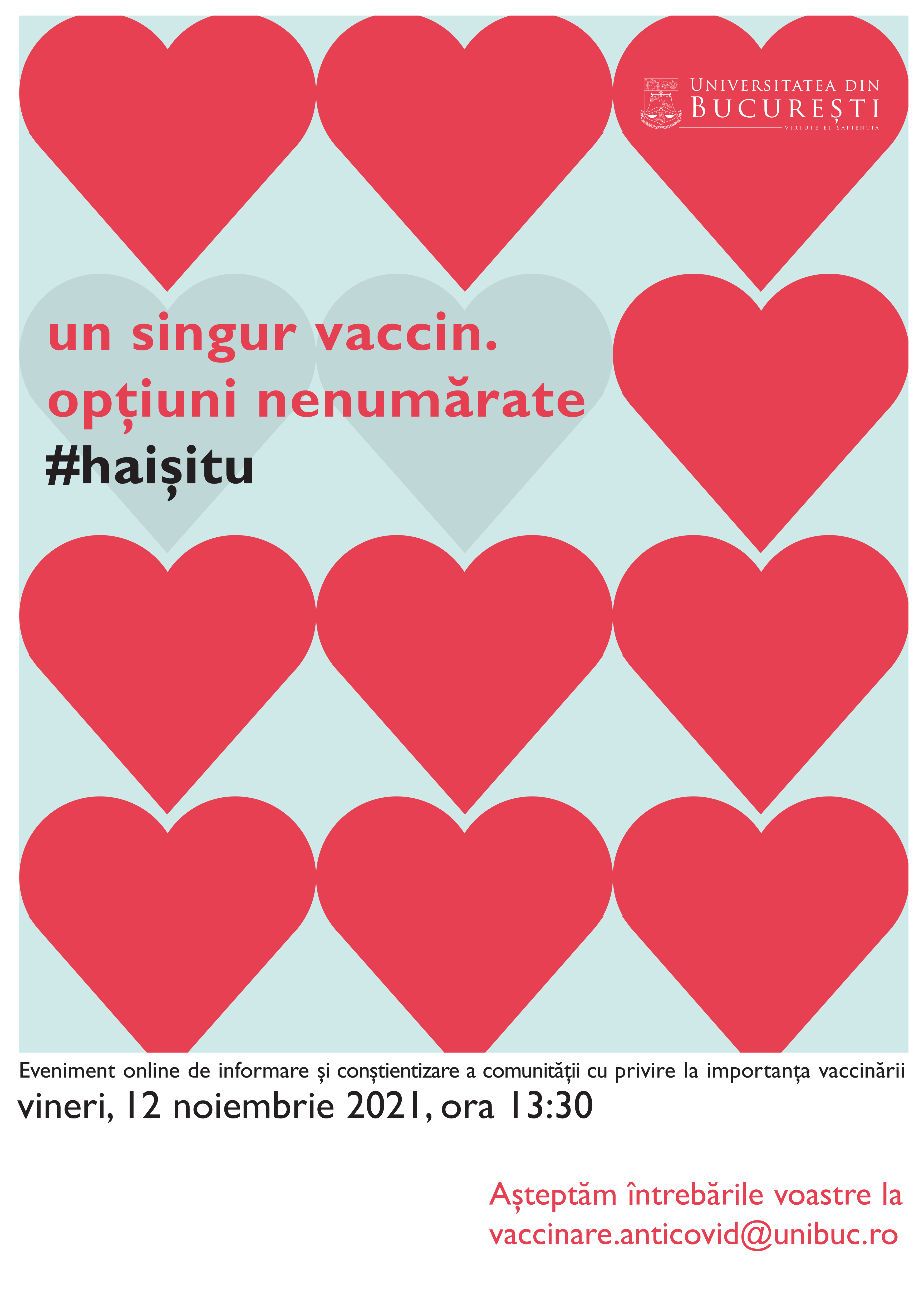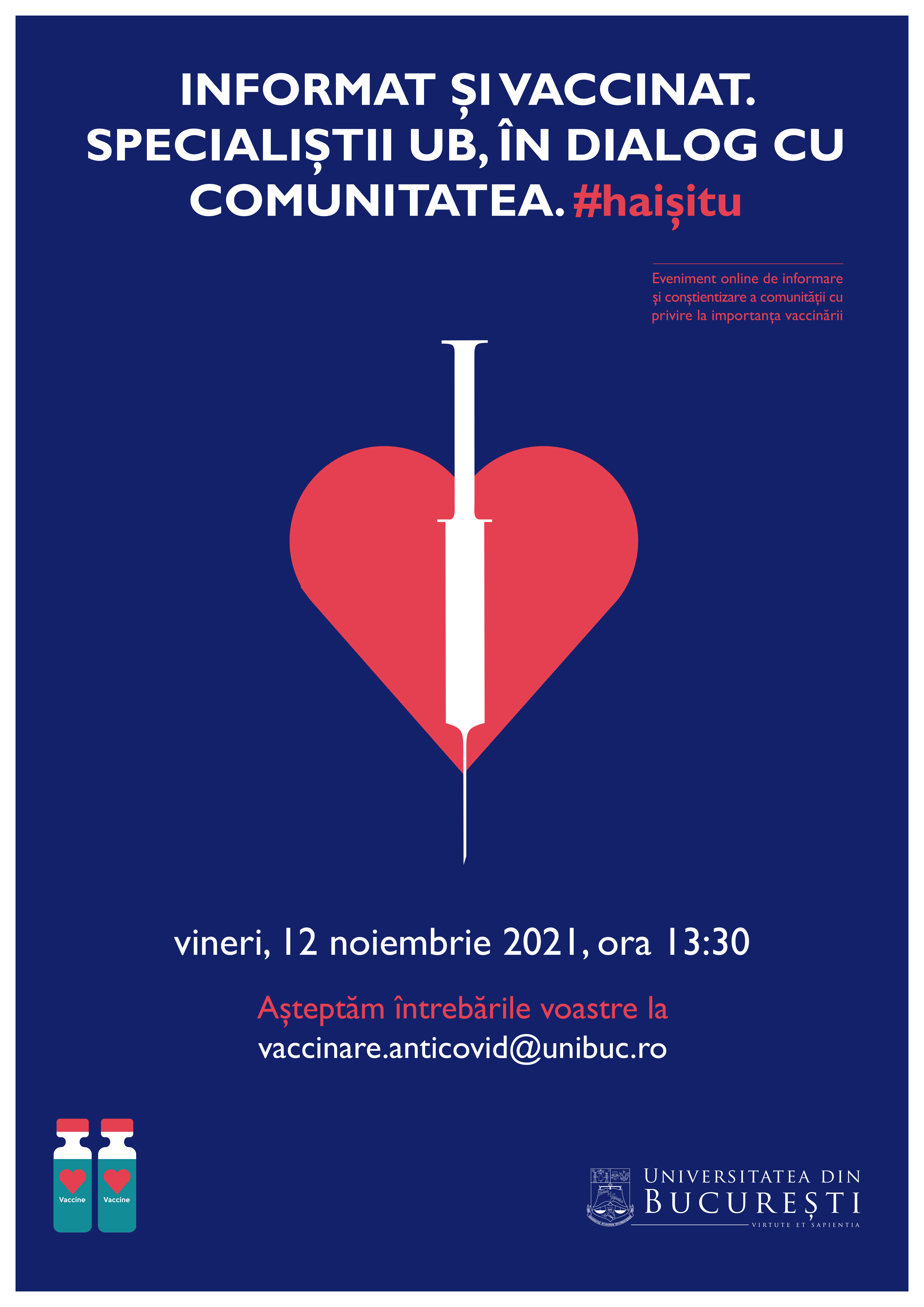 Într-o lume plină de informații contradictorii în care necesitatea de a discerne între știință și pseudo-știință, între adevăr și fake news este evidentă, specialiștii Universității din București vin în sprijinul comunității și provoacă societatea la un dialog cu privire la două teme pe cât de actuale, pe atât de sensibile: pandemia și vaccinarea. Vineri, 12 noiembrie 2021. #haișitu.